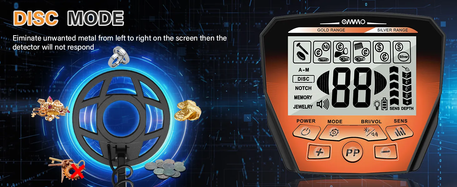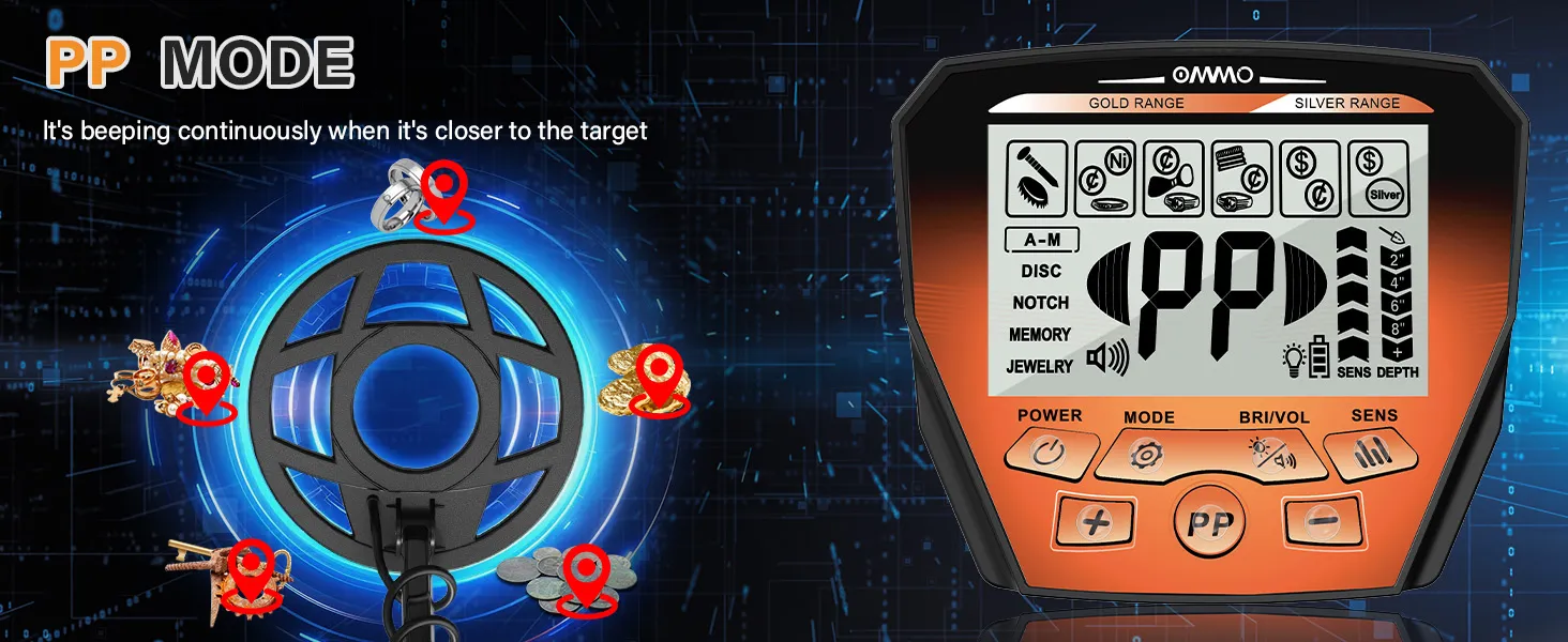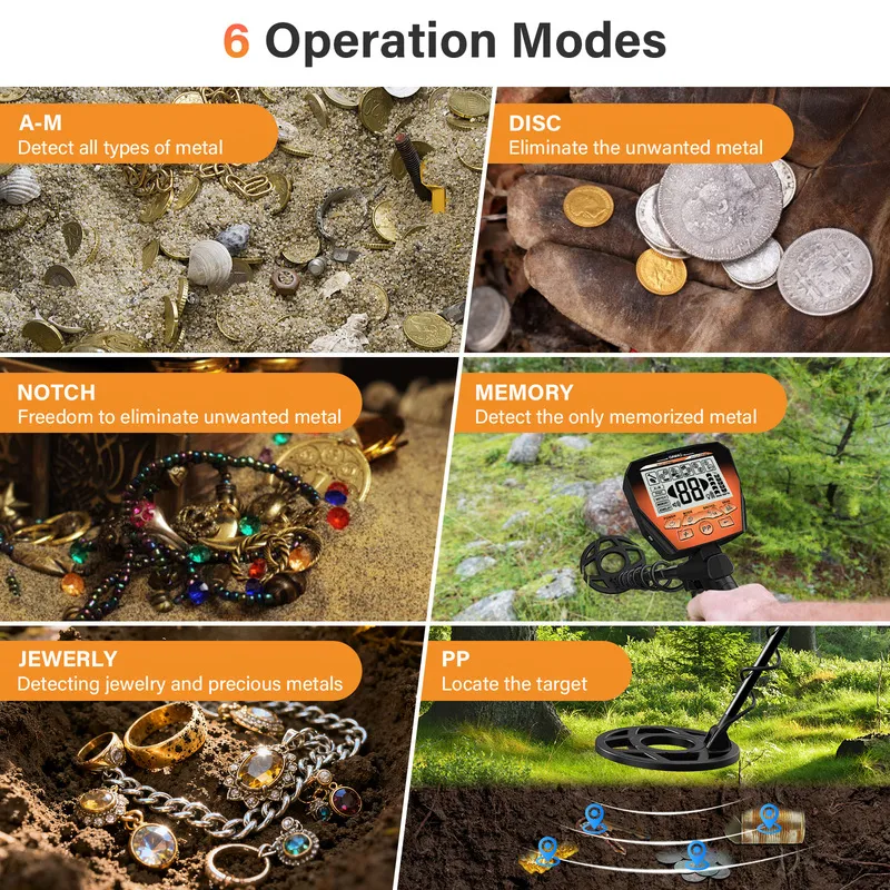 Has 6 Modes described as All METAL Mode: Steel, zinc, aluminum, gold, copper, silver and other metals could be detected. ¢ÚDISC Mode: Reject trash items. ¢Û NOTCH Mode: Eliminate unwanted metal by selecting the target on screen. ¢Ü MEMORY Mode: Remember the mode you set last time. ¢Ý JEWERLY Mode — Detect jewelry and precious metals. ¢Þ PP Mode: Locate the target by pressing and holding the PP button.