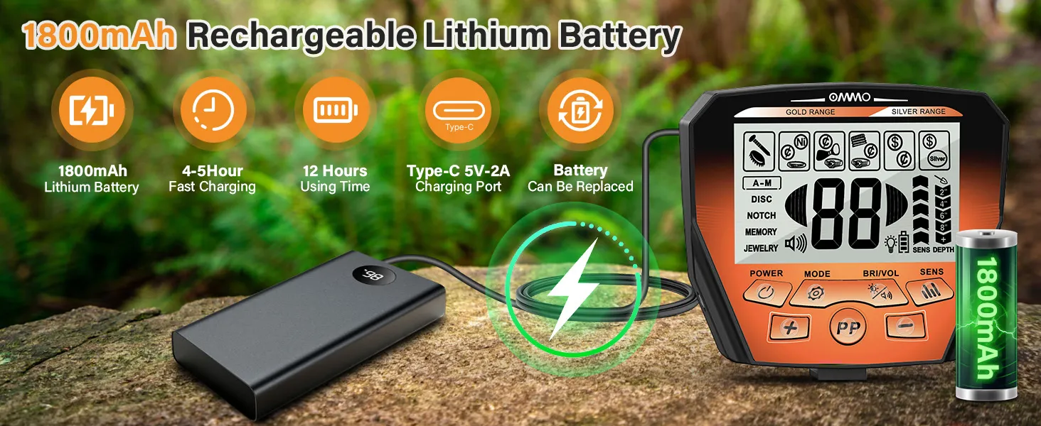 Never let a dead battery cut your adventure short. This detector features a built-in 1800mAh high-capacity lithium battery that provides over 15 hours of continuous hunting on a single charge. Thanks to the universal Type-C USB charging port, you can easily power up using a portable power bank, car charger, or laptop, eliminating the need for expensive and environmentally harmful disposable batteries.