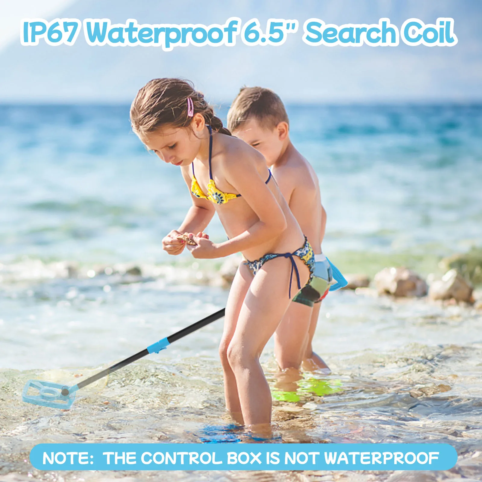 The 6.5″ IP67 waterproof search coil allows kids to explore beaches, streams, and shallow water for hidden treasures.