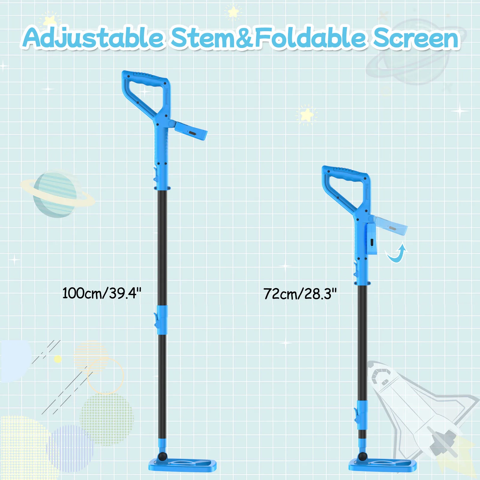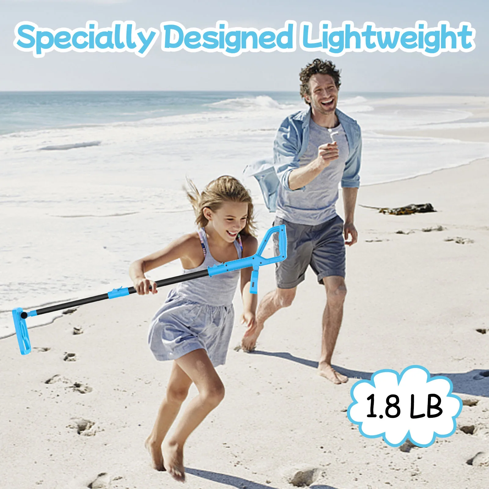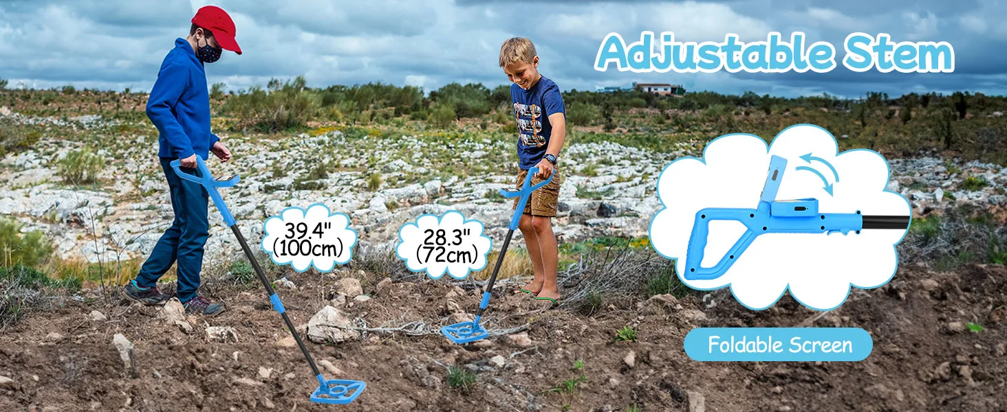 The detector features an adjustable stem (28.3″–39.4″) suitable for children of different heights, weighs only 1.8 lbs, and includes foldable parts for easy carrying. Ideal for outdoor activities and travel.